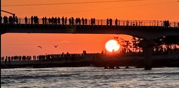강문해변과 경포해변을 잇는 솟대 다리도 일출 감상 포인트입니다 'GANGMUN'이라고 적힌 설치물, 반지 모양 벤치, 하트 벤치, 액자 벤치 등 다양한 포토존이 있어 사진 찍기에도 좋습니다.